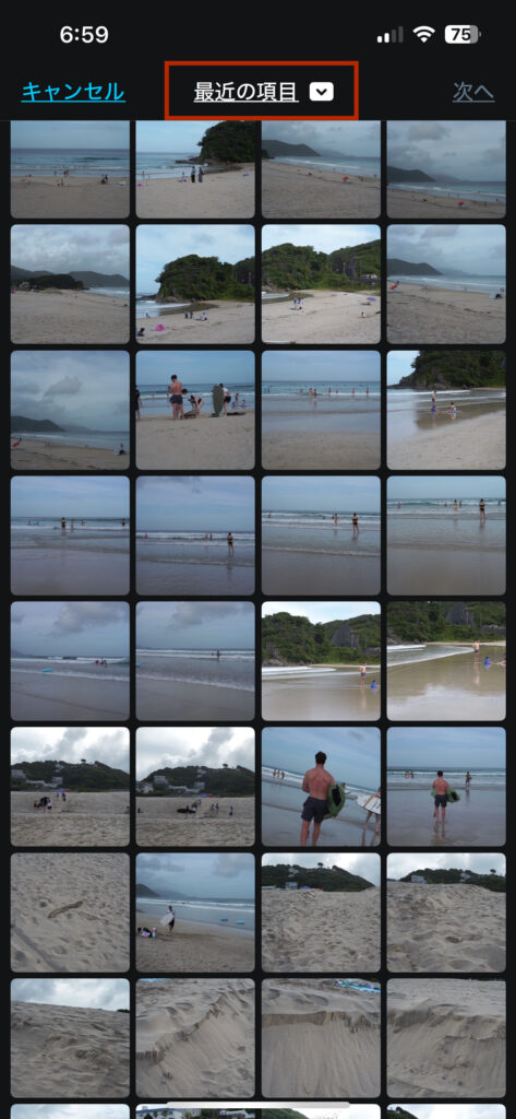 - 写真ソースを選ぶ: 「最近の項目」または「アルバム」をタブで切り替えます。写真アプリに連携するウィンドウが表示されるので「最近の項目」を選ぶと便利です。事前に「フォトスキャン」などのアルバムにまとめておくと効率的です。