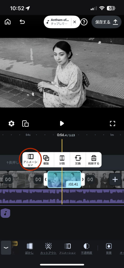 - 見切れを調整する: 顔が見切れているカットをタップし、ポップアップメニューから「アニメーション」を選びます。そのカットだけKen Burnsの開始・終了位置を個別に調整できます。