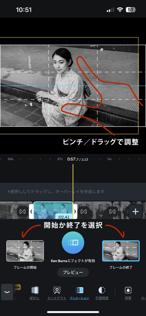 - 構図を微調整する: 「フレームの開始」または「フレームの終了」を選び、ピンチやドラッグ(2本の指で画像を動かしたり拡大・縮小する操作)で構図を整えます。これによりパンやズームの入り方・抜け方が自然になり、顔の欠けを防いで視線誘導もスムーズになります。