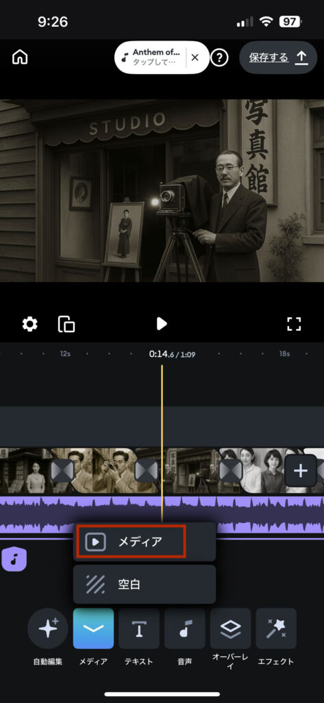 - 追加位置を決める: 挿入したい位置へドラッグで移動し、下部メニューの「メディア」→「メディア」を選びます。これで写真選択画面が表示され、ストーリー順を保ったまま素材追加が可能です。