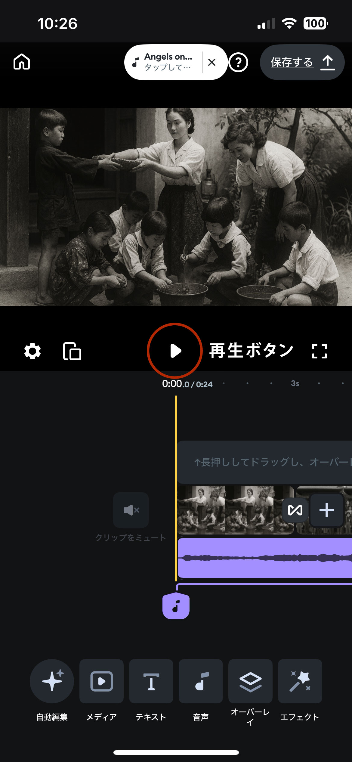 - BGMを決定して編集開始: 候補曲をタップして試聴し、「追加」を押して元の画面に戻り、「自動編集を開始」をタップします。音声トラックがタイムラインに入り、後から音量やフェードも調整できます。
