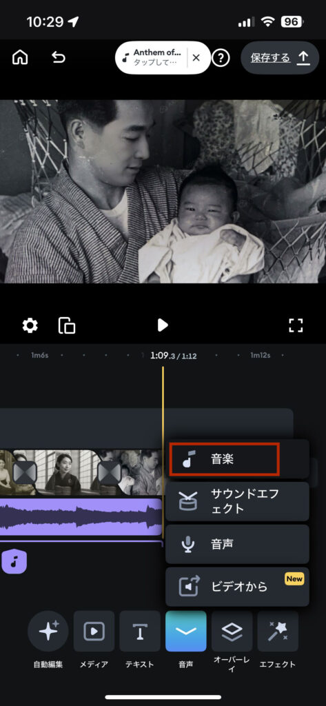 - BGMを選ぶ: 下部メニューから「音声」→「音楽」を選ぶと、BGM選択画面が開きます。