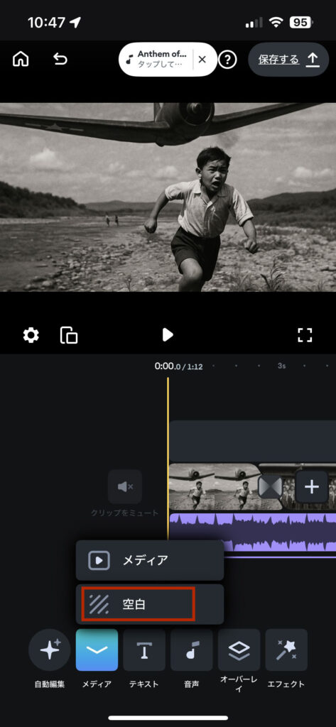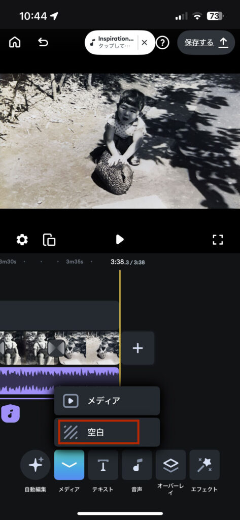 - 黒画面を追加する: 下部メニューの「メディア」→「空白」を選びます。最後の写真の後に追加すると、黒い無地クリップがタイムライン末尾に挿入されます。これでフェードアウトの準備が整います。
