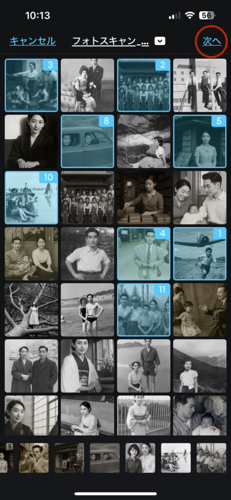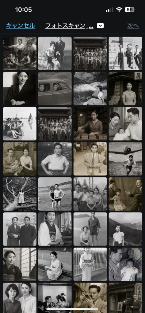 - 写真一覧を確認: アルバムが開いてサムネイルが並び、使いたい写真を選べる状態になります。