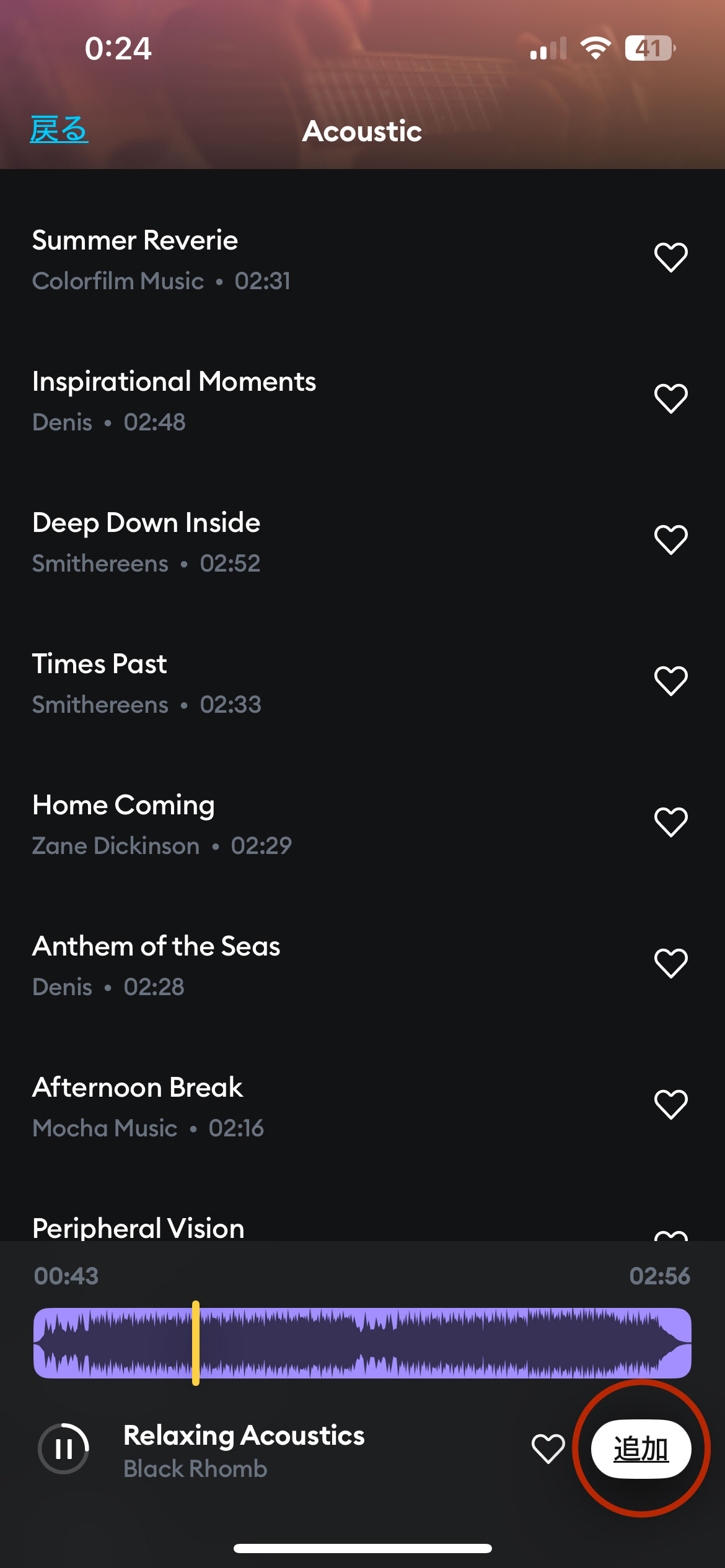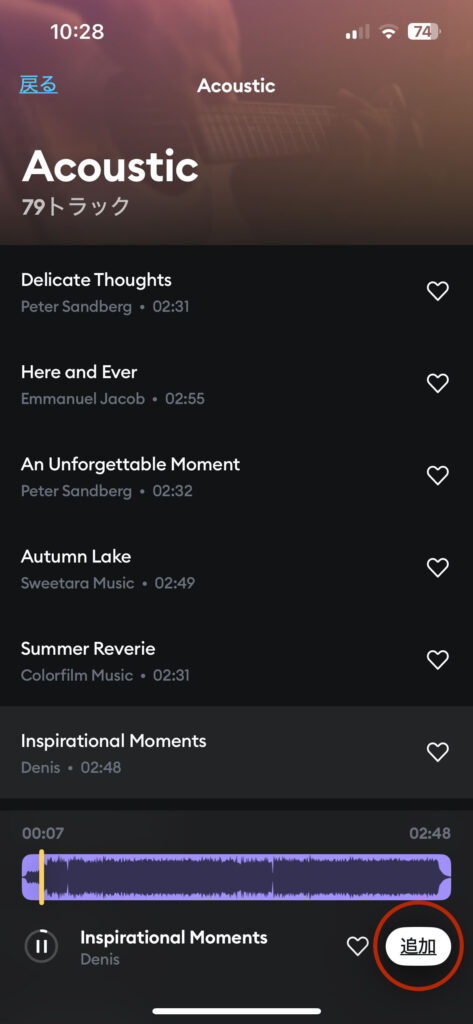 - 曲を挿入する: 曲を試聴し、「追加」を押すとタイムラインに挿入されます。