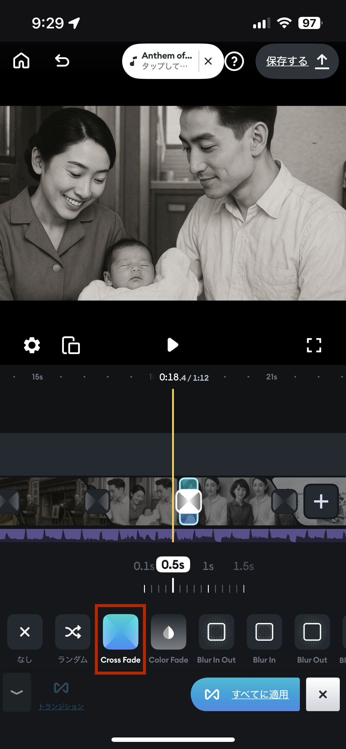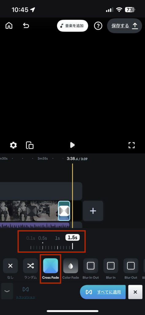 - クロスフェードを設定する: 最後の写真と黒画面の間にあるトランジションアイコンをタップし、「CrossFade」を選んでスライダーで長さを調整します。これで映像がふわっと黒に溶けます。