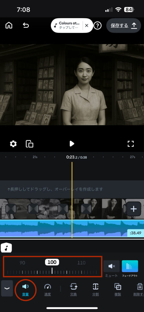 - 音量を調整する: 音声クリップをタップして「音量」を選び、スライダーで映像に合う音量に調整します。