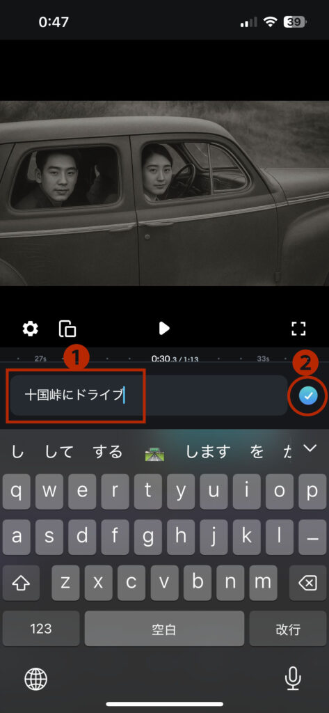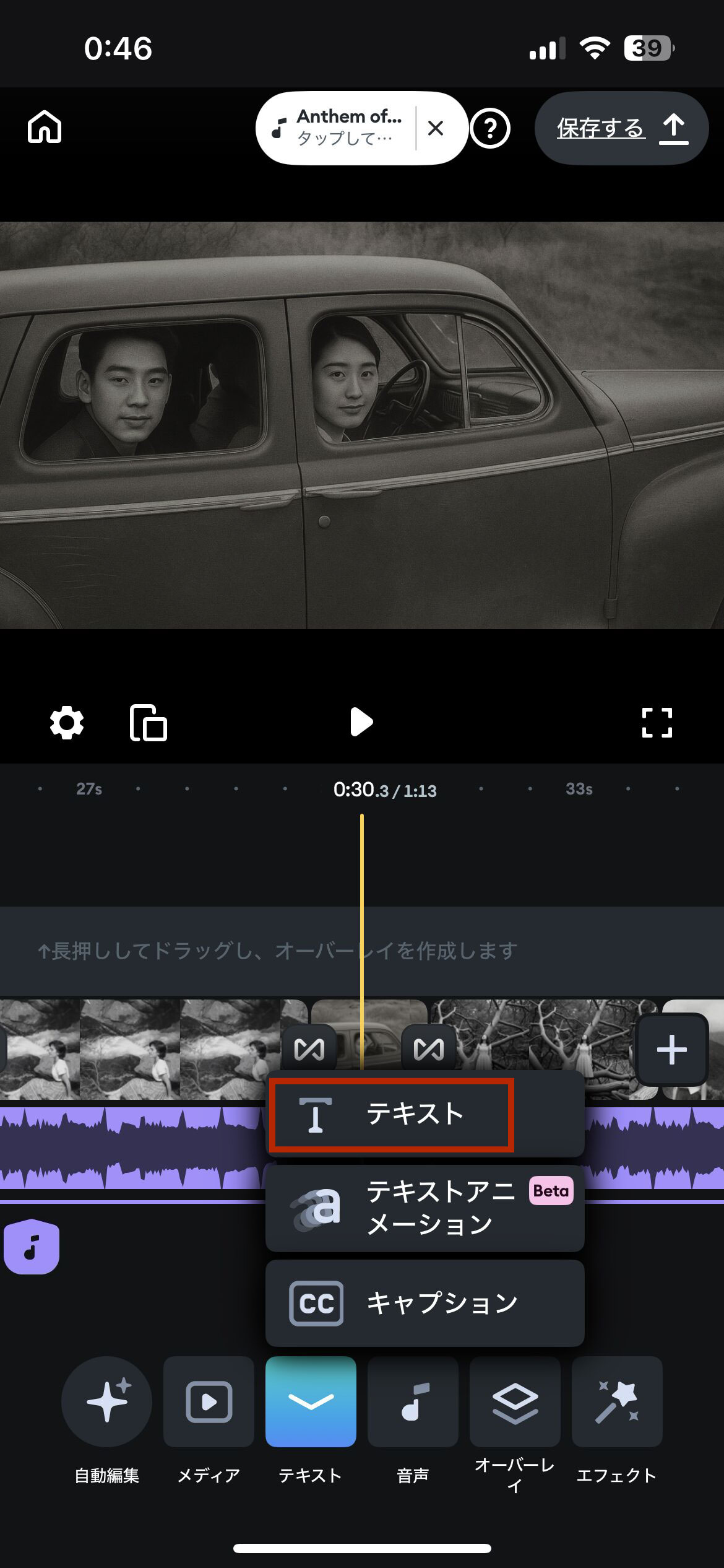 - テキストを追加する: 下部メニューの「テキスト」をタップすると、テロップレイヤーが作られます。
