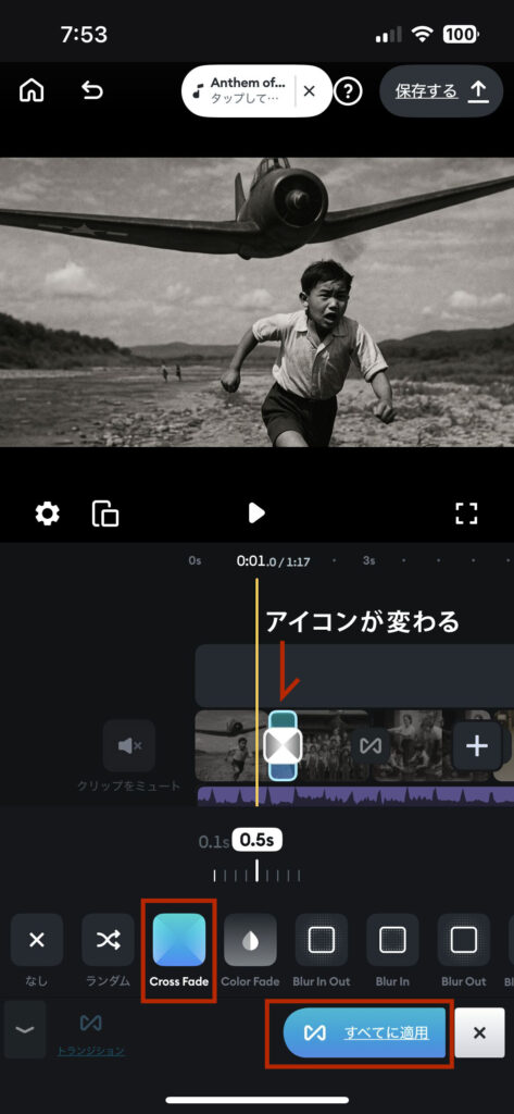 - 効果を適用する: 「Cross Fade(クロスフェード)」「Zoom In(ズームイン)」「Whip(ワイプ)」などをタップし、必要に応じて「すべてに適用」を選びます。全カットに一括反映され、統一感が出ます。