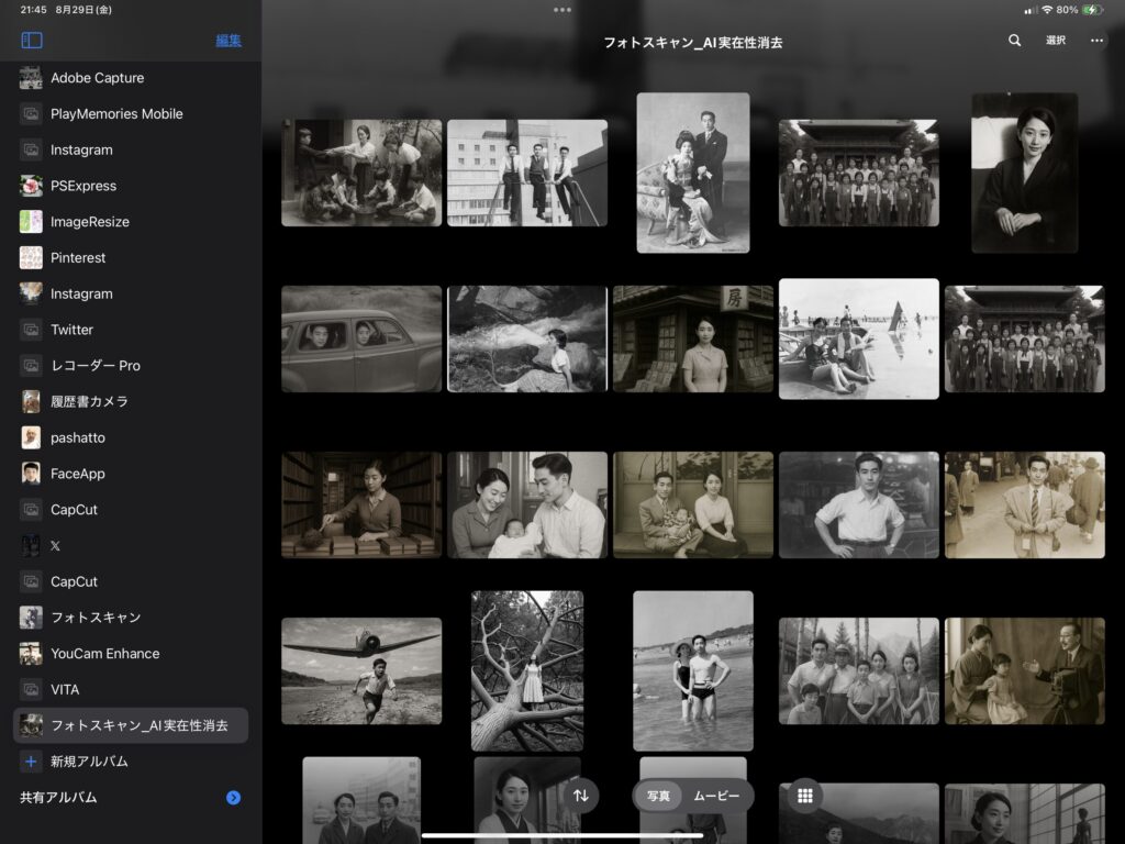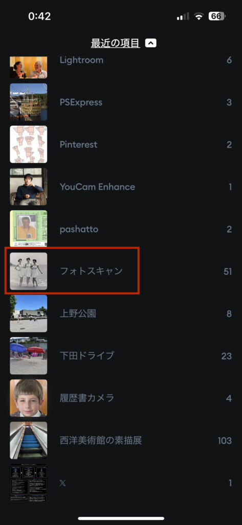 フォトスキャンを使ってなくても、使う予定の写真は写真アプリに入れて、写真アプリ内の「アルバム」にまとめると便利です。