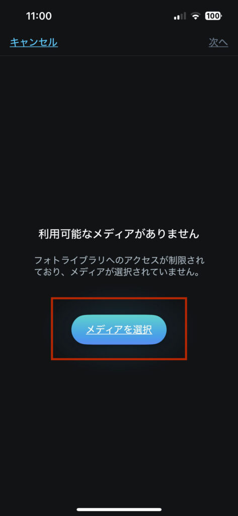①初回はフォトライブラリ(写真)へのアクセスを求められます。「メディアを選択」をタップ。