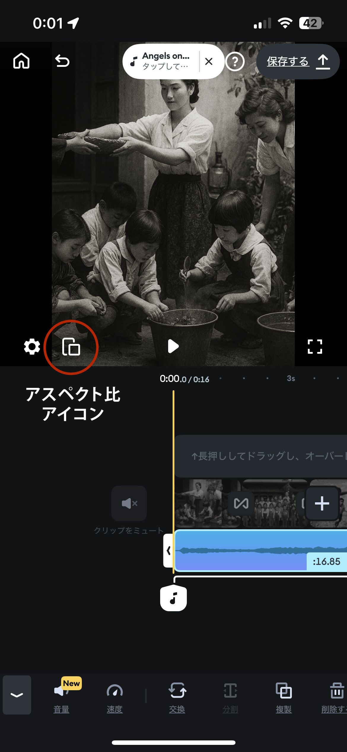 - アスペクト比を切り替える: アスペクト比アイコンをタップし、用途に合わせて
