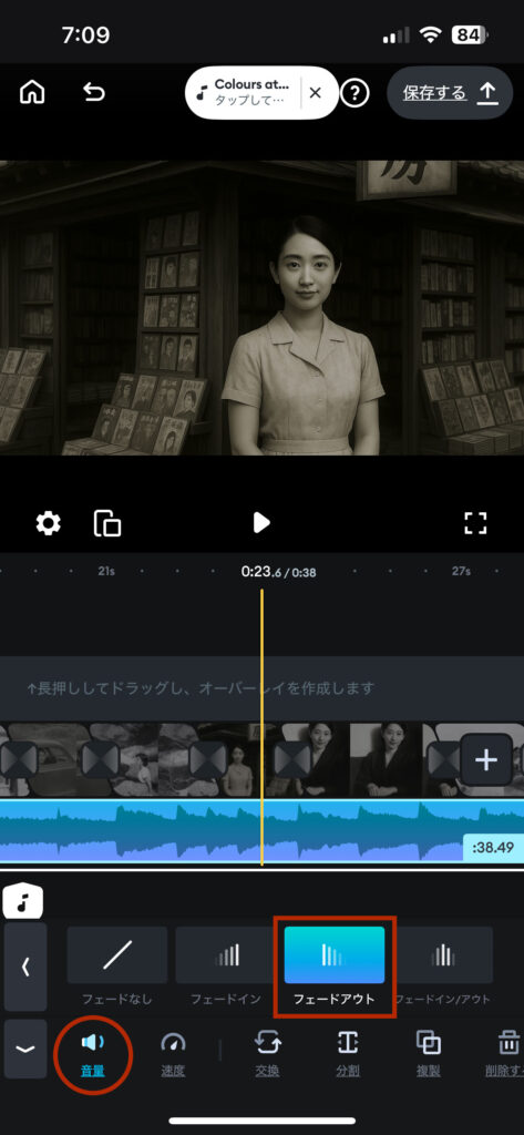 - フェードアウトを設定する: 同じ「音量」画面で「フェードアウト」をオンにすると、音が自然に下がって終わり、ブツ切り感を避けて余韻を残せます。