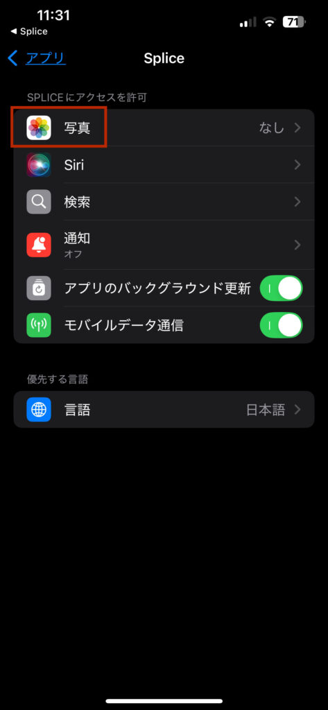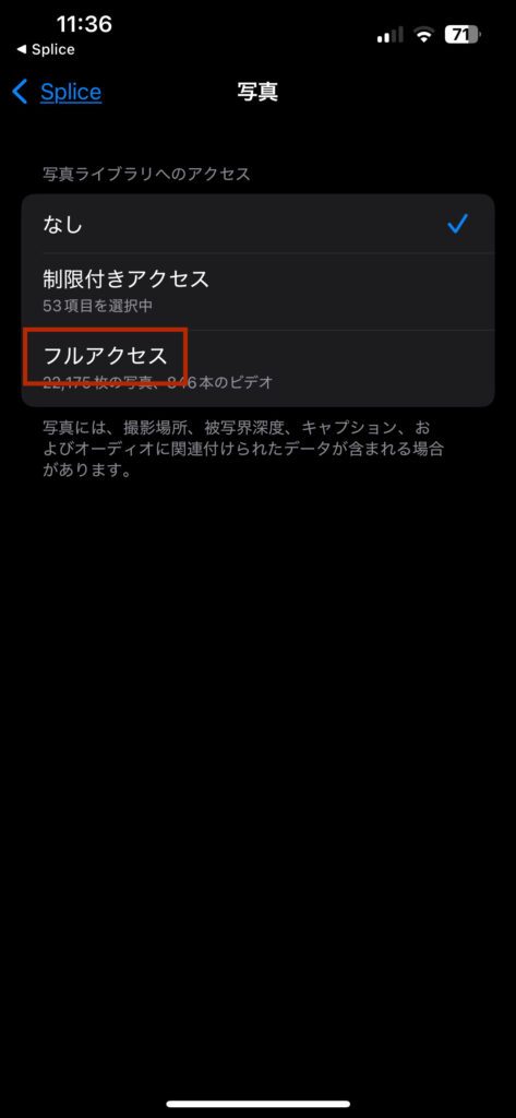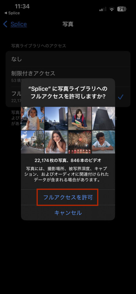 ③④“フルアクセス”を選ぶと後々ラクです。もし“制限付きアクセス”にしてしまったら、後で 設定>プライバシーとセキュリティ>写真>Splice から変更できます。