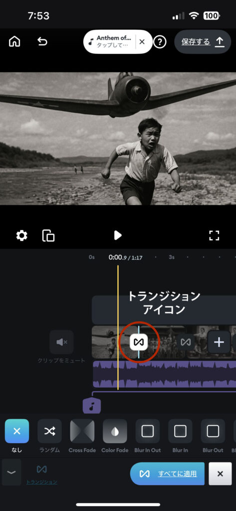 - トランジションを選ぶ: クリップ間の小さなトランジションアイコンをタップすると、適用可能な切り替え効果一覧が表示されます。