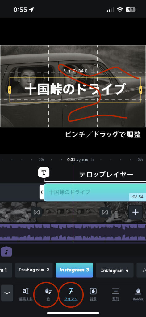 - フォントとサイズを調整する: タイムラインにテロップレイヤーが現れるので、スライドして再生ヘッド(中央の黄色い縦線)と重ねると画面にテキストが表示されます。テキストはピンチ/ドラッグ操作で拡大・縮小したり、画面下部から「フォント」や「色」を選んで変更できます。