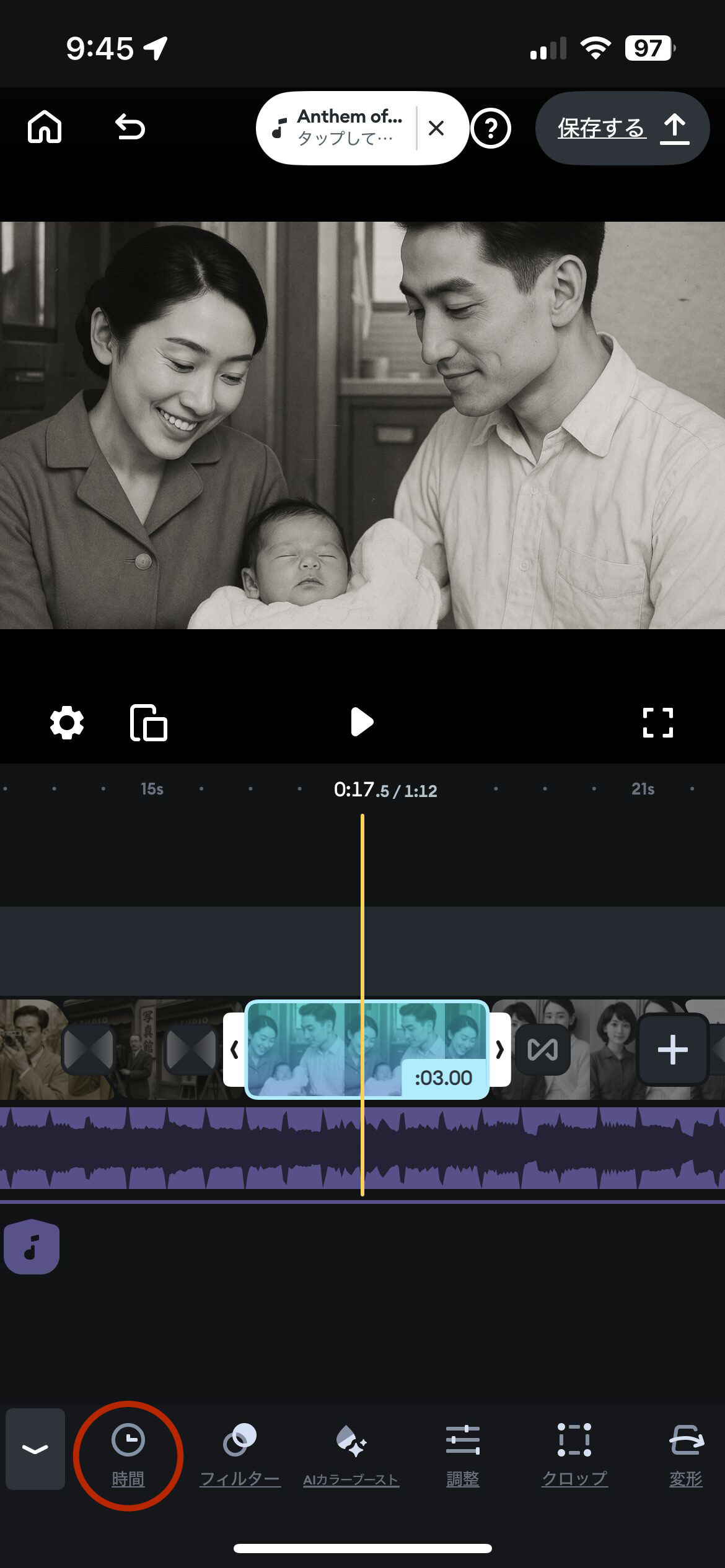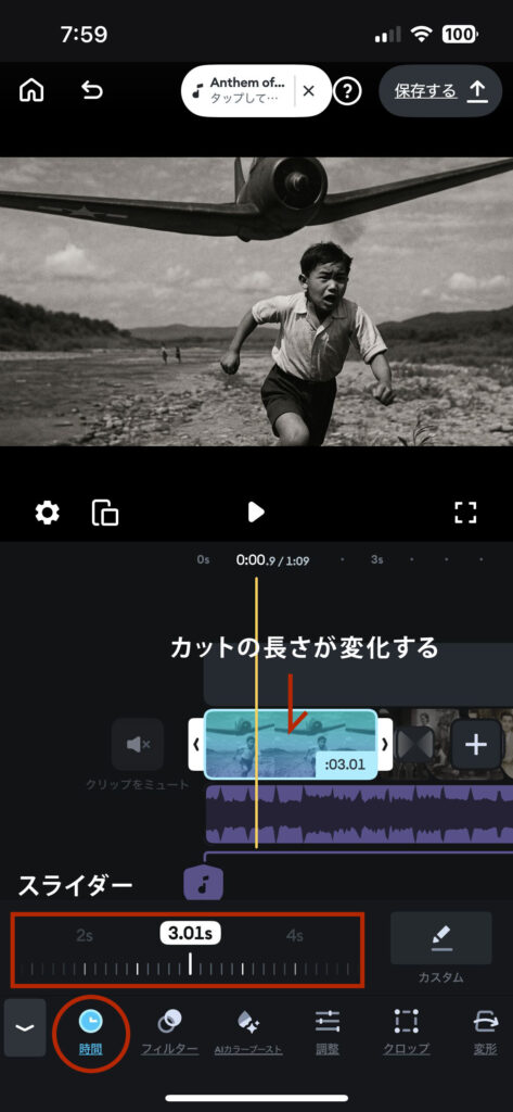 - 表示時間を調整する: カットをタップし、下部メニューから「時間」を選びます。スライダーで表示秒数を調整できます。目安は式典向けが4〜5秒、旅行ダイジェストなら2〜3秒です。