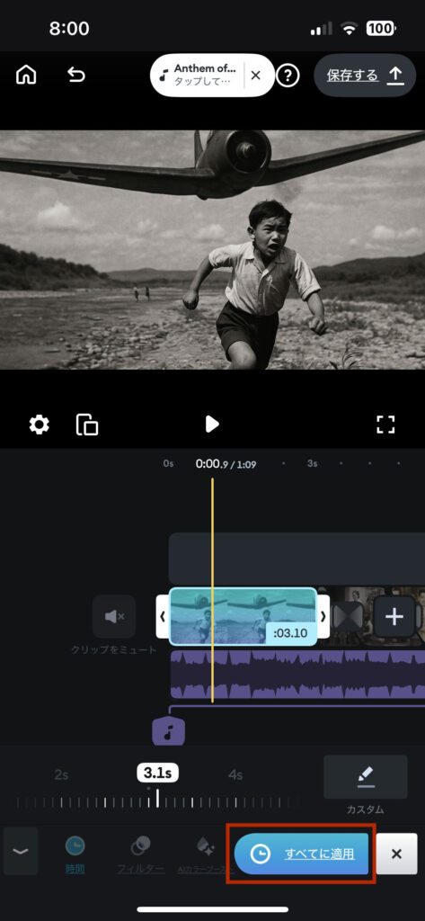 - 一括で時間を変更する: スライダー操作後に表示される「すべてに適用」をタップすると、全カットの秒数を一括で変更できます。BGMの尺との整合も取りやすく、迷った場合はBGM終盤をフェードアウトで調整すると自然です。