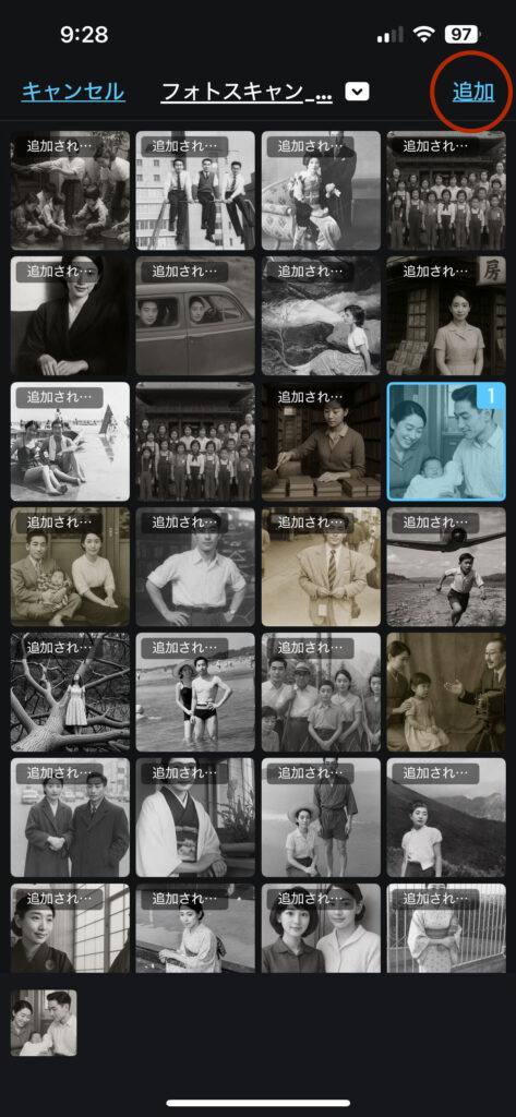 - 写真を選択する: 追加したい写真をタップし、「追加」を押すと、選択した写真が現在のタイムラインに挿入されます。