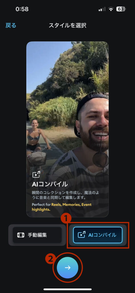 - AIコンパイルで仮完成版を作る: 「AIコンパイル」を選んで矢印をタップします。自動レイアウト+自動トリミング+Ken Burns効果つきで、すぐ“見せられる版”ができあがります。