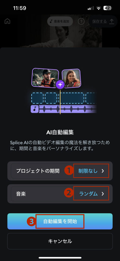 - プロジェクト時間と音楽を設定: 「プロジェクトの時間」で「制限なし」を選択すると「自動編集を開始」がアクティブになります。さらに「音楽」→「ランダム」を選ぶとBGM選択画面が開きます。