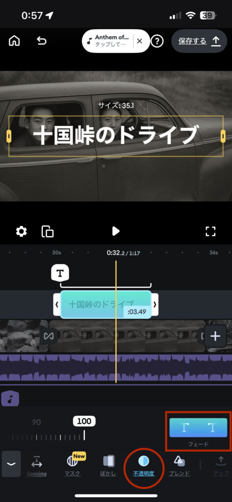 - フェード演出を設定する: テキストを選択した状態で、下部メニューの「不透明度」からフェードイン/アウトを設定します。言葉が自然に現れて静かに消える演出ができ、式典や法事の映像にも相性が良いです。